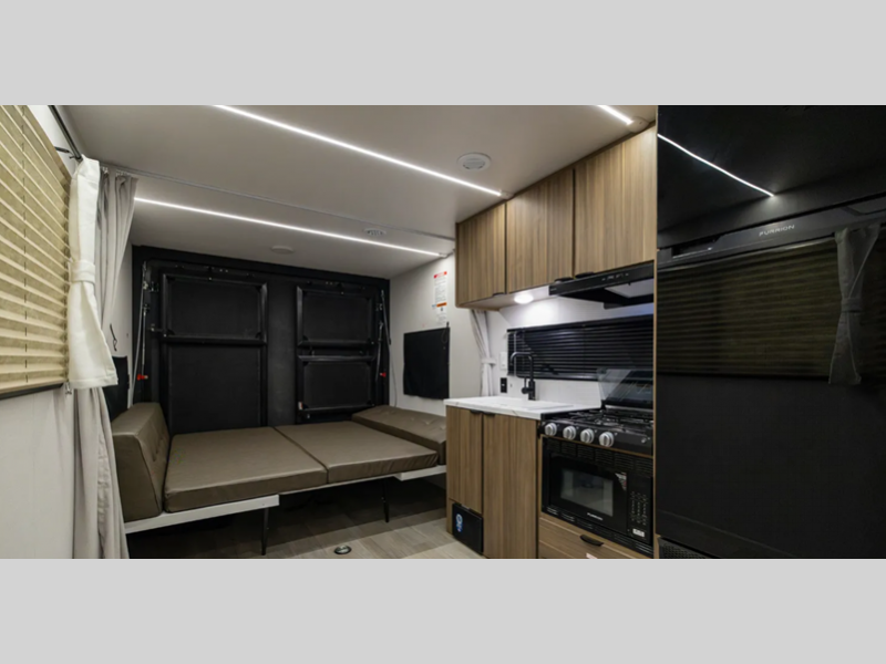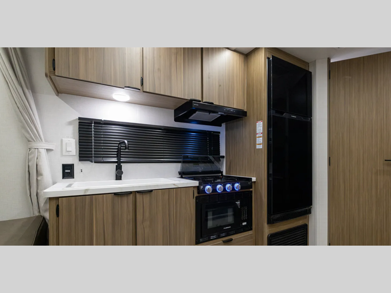 Sleeps 4 Length 23 ft 3 in Ext Width 8 ft Ext Height 11 ft 3 in Hitch Weight 695 lbs Dry Weight 4513 lbs Cargo Capacity 4982 lbs Fresh Water Capacity 54 gals Grey Water Capacity 43 gals Black Water Capacity 43 gals Furnace BTU 20000 btu Available Beds Queen Refrigerator Type Extra Large Black Glass 12V Convection Cooking Yes Cooktop Burners 3 Number of Awnings 1 Garage Size 10 ft 3 in LP Tank Capacity 20 lbs Water Heater Type On Demand Awning Info 14' Power w/Adjustable Legs and LED Light Strip Axle Count 2 Number of LP Tanks 2 Shower Type Neo-Angled Similar Floorplans