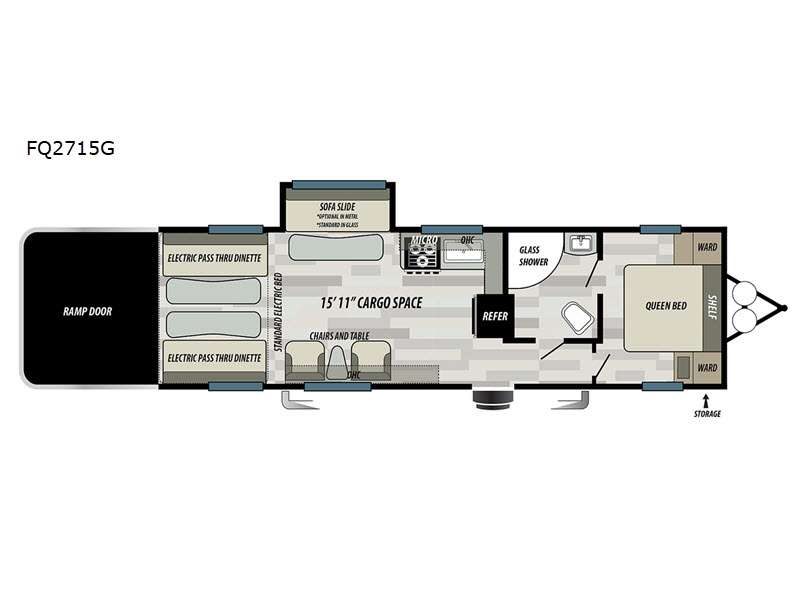 There is 15' 11" of cargo space and 1,200 lb. tie down rings mounted to steel for your off-road toys in this toy hauler! You can prepare your best home cooked meals with the three burner cooktop and enjoy them at the rear electric pass-through dinette. The leftovers can be stored in the 8 cu. ft. refrigerator, and you can relax in either the lounger chairs with a table in between or the sofa slide that comes standard in glass but can be switched to the optional metal. You could even relax on the electric bed above the dinette, the queen bed in the front private bedroom, or even take a hot shower in the dual entry bathroom with the radius glass shower. It also has a fiberglass exterior and front exterior storage for your gear!